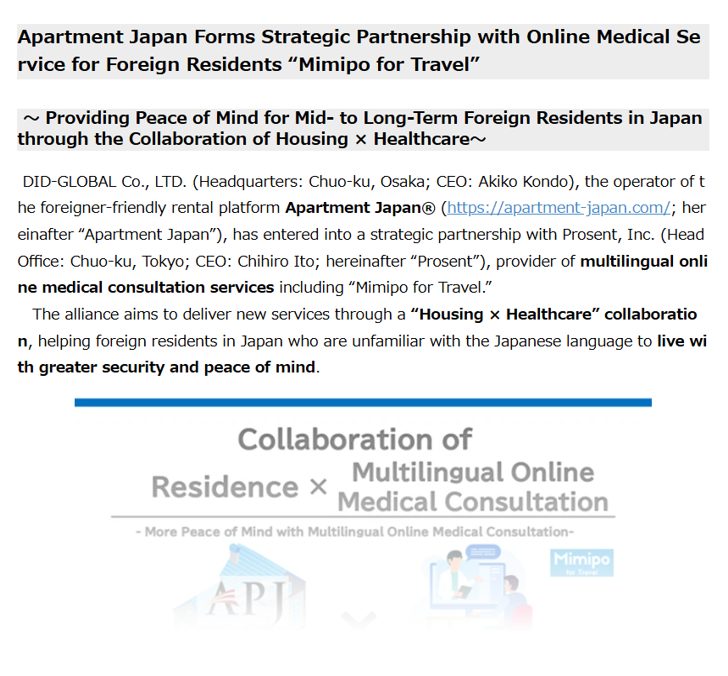 Apartment Japan has partnered with Procent Inc., operator of multilingual online medical services, to launch new initiatives combining housing and healthcare.