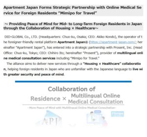 Home › › 2025-09-09 Related Articles 関連記事 Mutual link with “STUDY KYOTO”との相互リンク完了 【Notice of Summer Holidays】 Japanese traditional performing art “Noh” was shown under the cherry blossoms in full bloom. オンライン申込機能付き賃貸お部屋探しサイト「Apartment Japan」をプレスリリースしました! Apartment Japan will sponsor “Colive Fukuoka 2025” Press Release: Business Collaboration with the Online Medical Service