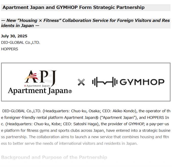 Apartment Japan is pleased to announce a new business partnership with HOPPERS Inc., the operator of a fitness platform that allows users to access sports gyms and fitness clubs on a pay-per-use basis. Through this collaboration, we will introduce a new integrated service combining housing and fitness options, designed to better support the lifestyle needs of foreign visitors and residents in Japan.